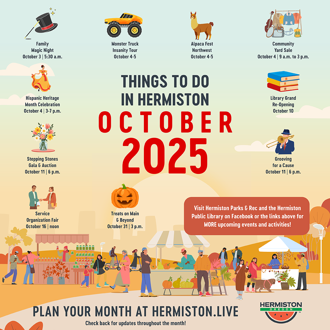 Come join us on Halloween (Friday, Oct. 31) for a safe and fun Trick-or-Treat activity in Downton Hermiston. Businesses will have signs in their windows inviting you in to collect treats. Afterwards, join us at the Hermiston Community Center for carnival games, haunted house, prizes, and much more for all ages. Opportunities for volunteering are available. (Sign up to hand out treats)