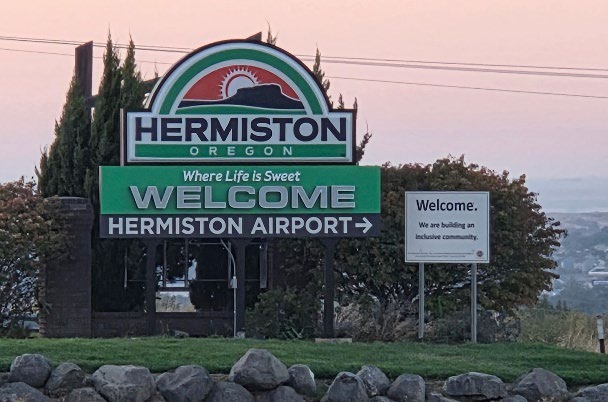 The new illuminated sign has been installed on the south end of Highway 395 to welcome people into Hermiston and more clearly direct them to the airport. Once the landscaping is complete, the sign will also be clearly visible from the north. Thanks for your patience as we updated this sign to better represent our vibrant community.