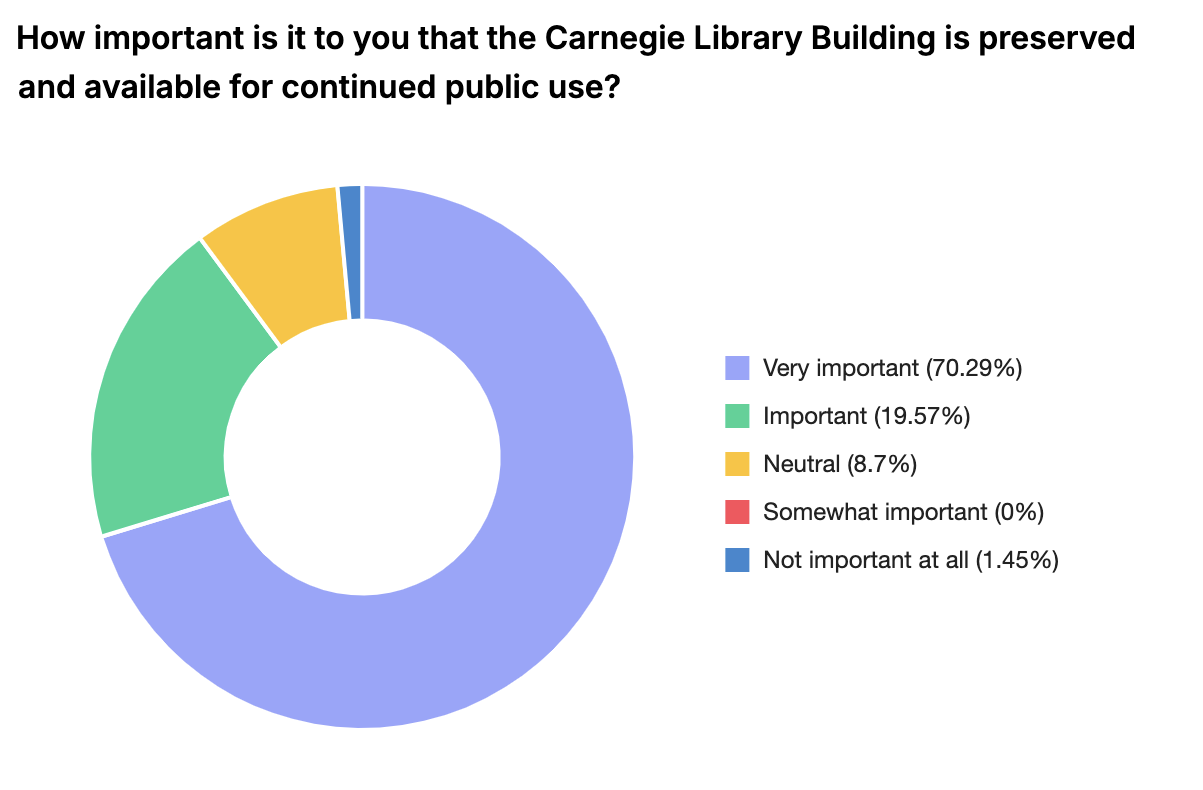 There are two weeks left in our Carnegie Library Building survey, and with more than 175 responses we're seeing that preserving the facility is a high priority for the community. If you haven't taken the survey yet online or in person, please take a minute to do so! |